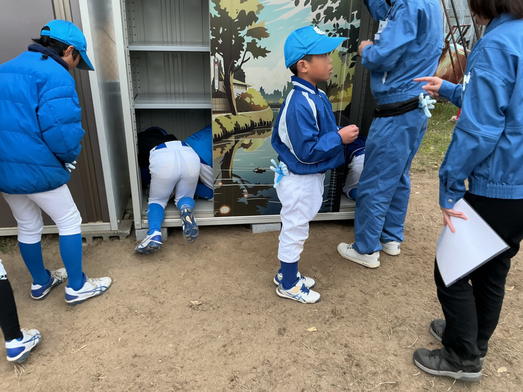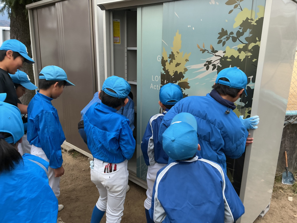 贈呈式に先立ち、田窪工業所の方々と国安ソフトボールスポーツ少年団のこどもたちが一緒に物置を組み立てました。こどもたちは、自分たちが使う物置を自らの手で組み立てることで、モノづくりの大切さや達成感を体験しました。