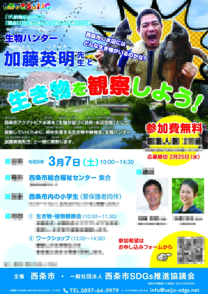 当日は、生物ハンターとして知られる加藤英明先生と、西条自然学校の法橋先生を講師に迎え、実際に水辺を歩きながら、生きものや自然について楽しく学びます。